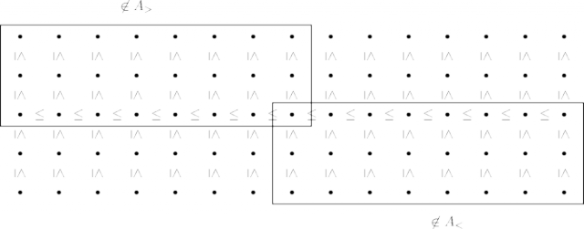 Zademonstrujemy to na następujacym przykładzie posegregowania tablicy liczbowej \( A[1..n] \) względem elementu \( x \). Dla zbiorów pozycji \( X,Y \) tablicy \( A \) piszemy \( X < Y \) gdy każda pozycja w X jest mniejsza od każdej pozycji w \( Y \). Piszemy \( A[X] < a \) gdy wartości na pozycjach X są mniejsze od a (podobnie z równością).