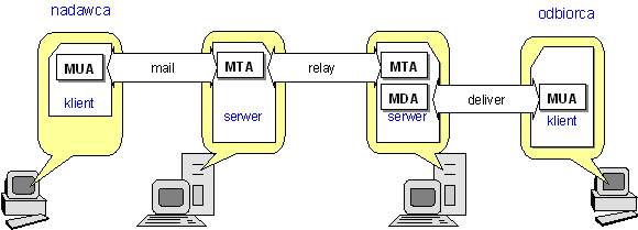Rysunek 2 przedstawia model komunikacji systemu internetowej usługi pocztowej standardu SMTP (RFC 821). Wyróżnione na nim elementy systemu to: