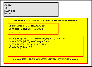 PEM to jeden z pierwszych standardów zaproponowanych do ochrony przesyłek protokołu SMTP i posiadający zgodny z pierwotnymi wymaganiami tego protokołu format RFC822 (rysunek 3). W PEM możliwa jest przede wszystkim kontrola integralności przy wykorzystaniu MD2 lub MD5 (128b) – zgodnie ze standardem RFC1421. Opcjonalnie możliwe jest szyfrowanie wiadomości – DES-ECB, 3DES (RFC1423). PEM wspiera zarządzanie kluczami i certyfikację wg ISO X.509 (RFC1422, RFC1424).