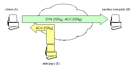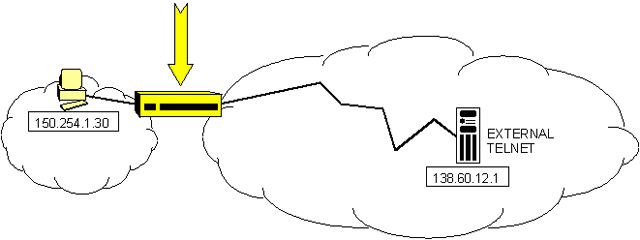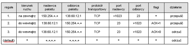 Przykład statycznych reguł filtracji pokazuje rysunek 5. Opisuje on filtrację przypadku z rysunku 6. Na nim mamy hipotetyczną sieć wewnętrzną, której stacjom zezwala się na nawiązywanie połączeń tylko wybranej usługi (w przykładzie – telnet) i jedynie z wybranym serwerem zewnętrznym.