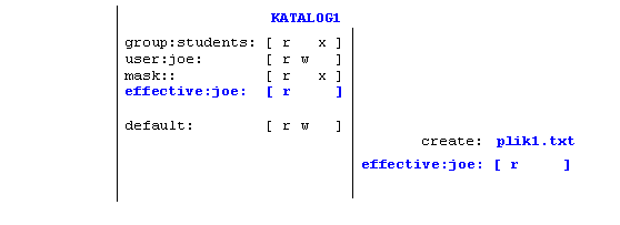 % setfacl -d -m group:testowa:wx bsk-lab1 % getfacl bsk-lab1 –-omit-header user::rwx group::r-x other::r-x default:user::rwx default:group::r-x default:group:testowa:-wx default:mask::rwx default:other::r-x