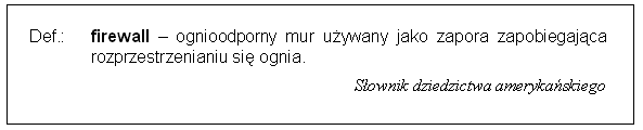 W dziedzinie zabezpieczeń ruchu sieciowego dużą rolę odgrywają systemy kontroli komunikacji nazywane w języku ang. firewall. W języku polskim ścierają się na ogół dwa terminy: zapora sieciowa oraz ściana przeciwogniowa. Drugi z nich jest tłumaczeniem rdzennego pojęcia amerykańskiego (rysunek 1)