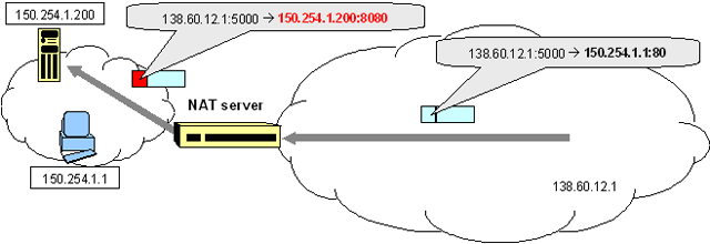 W mechanizmie Destination NAT (DNAT) pakiety przychodzące ze strony inicjującej (na ogół – sieci zewnętrznej) otrzymują nowy adres docelowy (w tym w szczególności – port). Celem może być przekierowanie ruchu określonej usługi pod rzeczywisty, nie ujawniany na zewnątrz, adres wewnętrznego serwera tej usługi. Na rysunku 12 adres serwera (o jaką usługę chodzi w tym przykładzie?) upubliczniony na zewnątrz jest równy 150.254.1.1, podczas gdy rzeczywisty adres to 150.254.1.200.