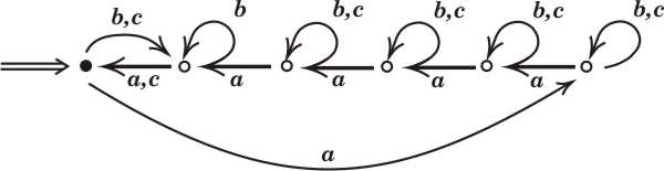 Na powyższych rysunkach \(n=7\), stan początkowy jest wskazany przez \(\Rightarrow\), a stan akceptujący jest oznaczony przez \(\bullet\).