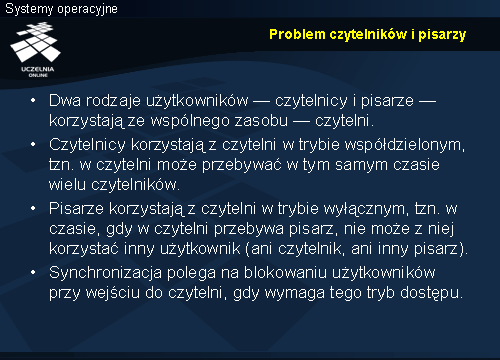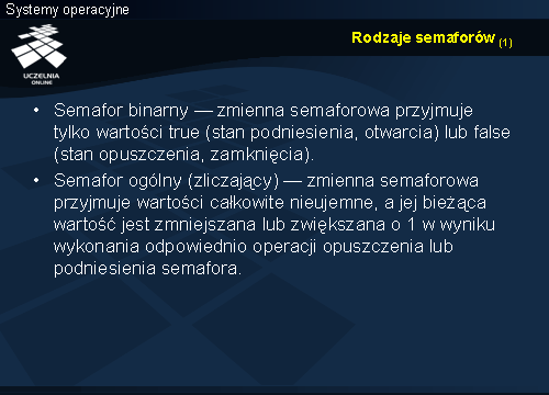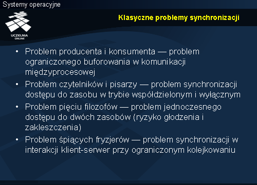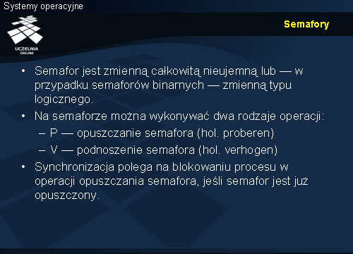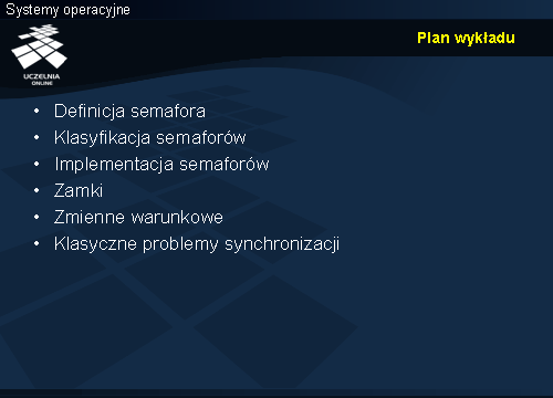 Wykład składa się z trzech części. Pierwsza obejmuje semafory, ich abstrakcyjną definicję, klasyfikację oraz sposoby implementacji. Druga dotyczy mechanizmów standardu POSIX i sposobu ich użycia w synchronizacji. Ostatnia z zasadniczych części wykładu obejmuje klasyczne problemy synchronizacji procesów — producenta i konsumenta, czytelników i pisarzy, pięciu filozofów oraz śpiących fryzjerów. Przedstawione zostaną rozwiązania tych problemów z użyciem semaforów. Na koniec pojawi się krótka wzmianka o strukturalnych mechanizmach synchronizacji.