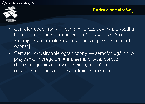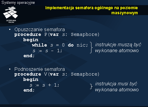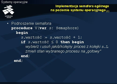 Nieco bardziej skomplikowany jest przypadek implementacji semaforów uogólnionych. Pozostawia się to jako ćwiczenie. Warto mieć jednak na uwadze dwa kryteria przy podnoszeniu semafora: