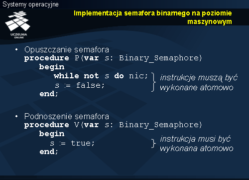 W podobny sposób można zrealizować semafor binarny, z tą różnicą, że jeśli pole wartość jest równe 1 (co oznacza otwarcie), a wykonywana jest operacja podnoszenia, to stan semafora nie ulega zmianie, czyli: