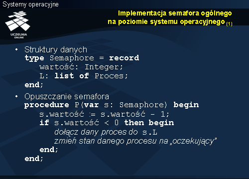 Zamiast permanentnego testowania zmiennej semaforowej, stan procesu zmieniany jest na oczekujący , w związku z czym planista przydziału procesora nie uwzględnia go, wybierając proces do wykonania. Z semaforem wiąże się kolejka procesów oczekujących na jego podniesienie. W definicji struktury danych na potrzeby semafora użyto abstrakcyjnej konstrukcji list of . Kolejkę taką można zbudować w oparciu o odpowiednie pola do wskazywania procesów, przechowywane w deskryptorze procesu. W strukturze semaforowej jest wówczas tzw. głowa listy, czyli wskaźnik na deskryptor pierwszego z oczekujących procesów.