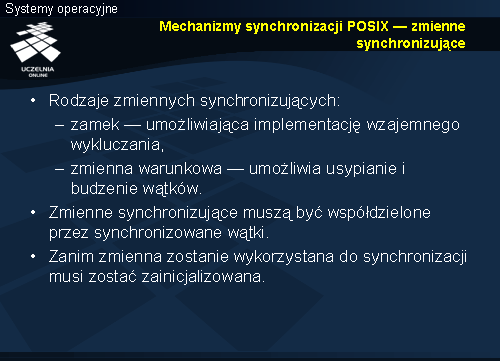 Jeśli zmienne mają być użyte do synchronizacji, muszą znajdować się w obszarze pamięci dostępnym dla synchronizowanych wątków. We wszystkich operacjach zmienne synchronizujące udostępniane są przez wskaźniki. Użycie zmiennej synchronizującej musi być poprzedzone jej inicjalizacją.