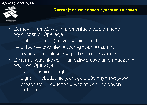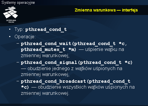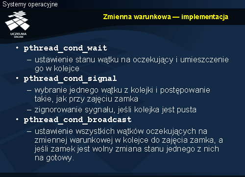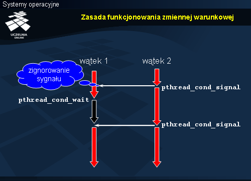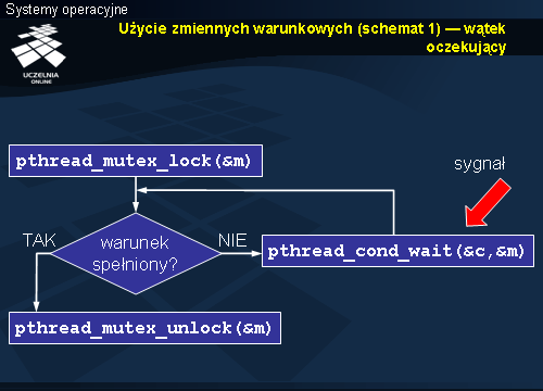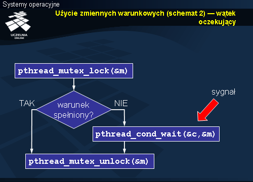 Wywołanie funkcji pthread_cond_wait powoduje wejście wątku w stan oczekiwania na sygnał, który z kolei musi wysłać inny wątek, wywołując funkcję pthread_cond_signal lub pthread_cond_broadcast. Na czas oczekiwania następuje zwolnienie zamka, do którego wskaźnik przekazywany jest jako drugi parametr funkcji pthread_cond_wait. Jak można się domyślać funkcja ta wywoływana jest w sekcji krytycznej. Dokładniej zostanie to omówiony przy schematach synchronizacji w dalszej części.