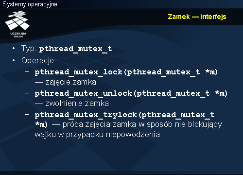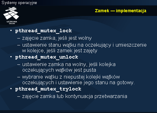 Zwolnienie zamka z kolei następuje w wyniku wywołania funkcji pthread_mutex_unlock przez ten wątek, który wcześniej zamek zajął. Funkcja pthread_mutex_trylock służy również do zajmowania zamka, ale nie powoduje zablokowania wątku w przypadku, gdy zamek jest zajęty. Zwracany jest wówczas tylko odpowiedni status zakończenia operacji, po którym można rozpoznać efekt.