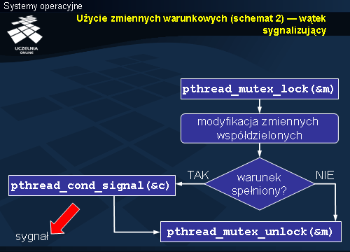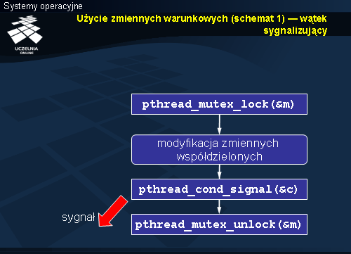 Wysłanie sygnału przez wątek sygnalizujący (wywołanie pthread_cond_signal) na ogół odbywa się w sekcji krytycznej i najczęściej jest ostatnią operacją wykonywaną w tej sekcji. Warto zwrócić uwagę, że dopiero opuszczenie sekcji krytycznej (wywołanie funkcji pthread_mutex_unlock) umożliwia przejście wątku budzonego w stan gotowości, czyli właściwe opuszczenie funkcji pthread_cond_wait. Wątek sygnalizujący nie musi jednak natychmiast wyjść z sekcji krytycznej. Potencjalnie nawet mógłby dokonać kolejnych modyfikacji współdzielonych zmiennych, w wyniku których oczekiwany warunek byłby ponownie niespełniony, co kwestionowałoby zasadność schematu 2. Szerszą dyskusję na ten temat można znaleźć w literaturze przy okazji omawiania monitorów.