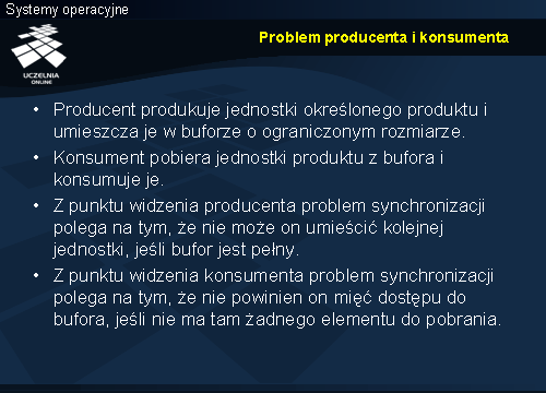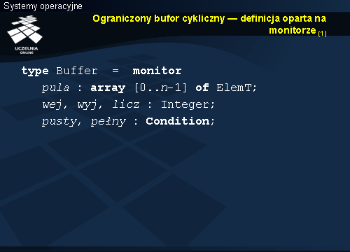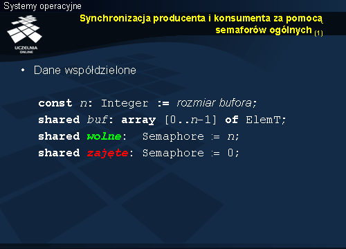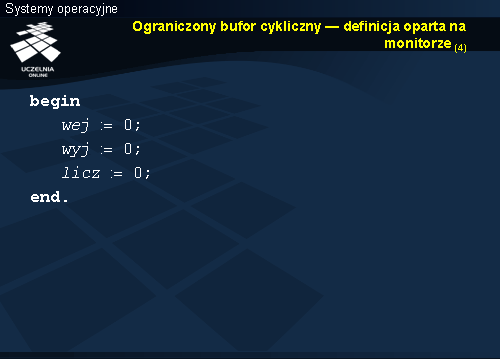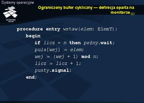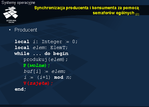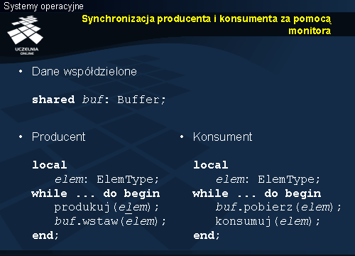 Usypianie i budzenie odbywa się niejawnie w zależności od wypełnienia bufora. Taki sam warunek sprawdzany był w przypadku monitora, ale usypianie a następnie budzenie wymagało jawnego użycia w kodzie instrukcji wait i signal .