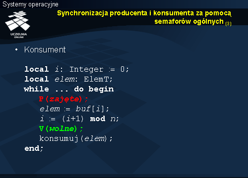 Jeśli konsument uzyska dostęp do bufora, pobierze element i tym samym zwolni miejsce. Fakt ten zasygnalizuje poprzez podniesieni semafora wolne, co z kolei umożliwi wykonanie kolejnego kroku producentowi.