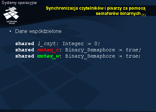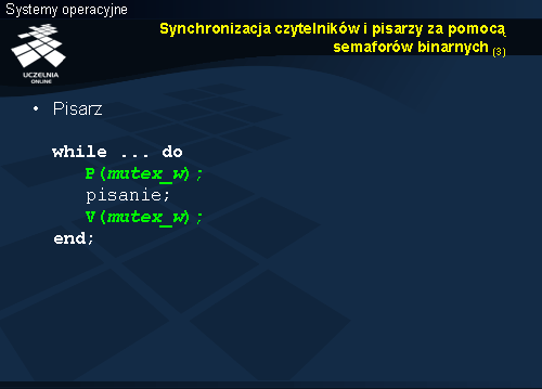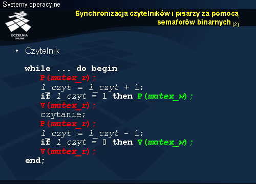 Przy wyjściu czytelnika z czytelni zmniejszana jest wartość zmiennej l_czyt. Operacja chroniona jest oczywiście przez semafor mutex_r, gwarantujący realizację w sekcji krytycznej. Gdyby po zmniejszeniu zmiennej l_czyt okazało się, że jest ona równa 0, to znaczy, że z czytelni wyszedł ostatni czytelnik i można dać szansę pisarzowi. Podnoszony jest zatem semafor mutex_w.