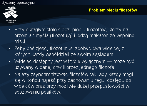 Problem pięciu filozofów wiąże się z dostępem procesu do wielu różnych zasobów (w tym przypadku dwóch) w tym samym czasie. Skutkiem braku odpowiedniej koordynacji może być zakleszczenie (ang. deadlock), zagłodzenie któregoś procesu (ang. starvation) lub uwięzienie (ang. livelock).