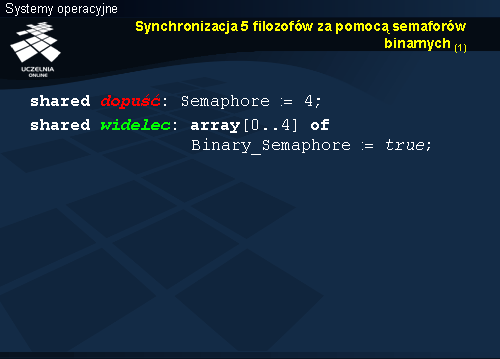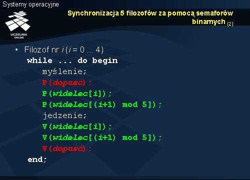 Przed podjęciem próby zdobycia widelców filozof opuszcza semafor dopuść . Jeśli byłby piątym procesem, dopuszczonym do rywalizacji, jest ryzyko powstania cyklu i zakleszczenia. Semafor dopuść dopuszcza jednak tylko czterech filozofów, w związku z czym nie ma ryzyka cyklu.