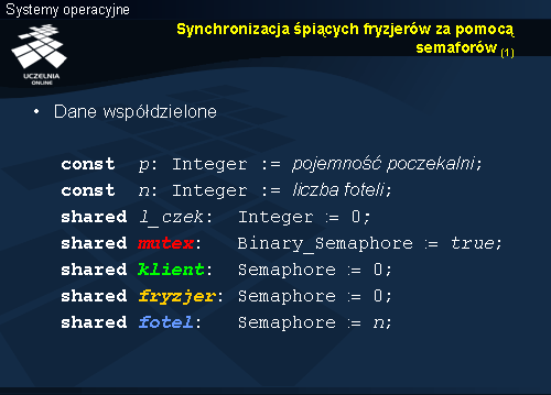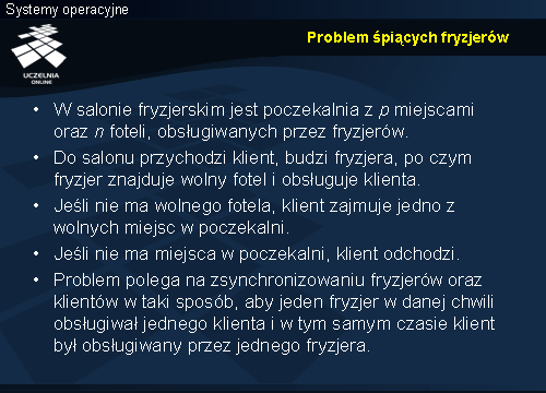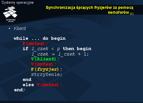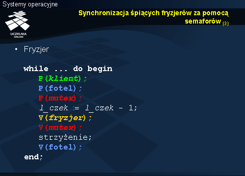 Fryzjer czeka na klienta na semaforze klient , który jest podnoszony przez klienta po uzyskaniu miejsca w poczekalni. Po zakończeniu tej operacji fryzjer wie, że ma klienta więc czeka na wolny fotel opuszczając semafor fotel . Jeśli operacja się zakończy to jest fotel dla klienta i można przejść do obsługi. Najpierw zmniejszana jest zmienna l_czek , bo zwalnia się miejsce w poczekalni. Następnie poprzez podniesienie semafora fryzjer , przekazywany jest klientowi sygnał, że może wyjść ze stanu czekania i przejść do właściwej obsługi. Po zwolnieniu semafora mutex fryzjer też przechodzi do obsługi, po zakończeniu której zwalnia fotel (podnosi semafor fotel ).