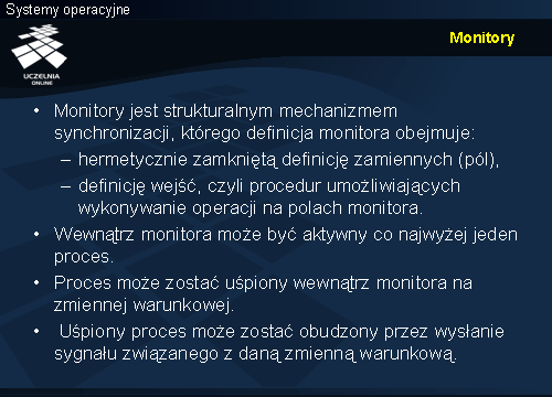 Częścią definicji monitora są zmienne warunkowe, na których proces może jawnie usnąć, a następnie zostać obudzony. Podobnie jak w przypadku mechanizmów POSIX, na czas uśpienia monitor jest zwalniany. W ten sposób uśpiony proces może kiedyś zostać obudzony przez inny proces, który wyśle sygnał na danej zmiennej. Warto jednak podkreślić, że zmienne warunkowe, jako wewnętrzne zmienne monitora, dostępne są tylko w ramach wejść. Zarówno usypianie jak i budzenie procesu jest częścią implementacji jakiegoś wejścia.