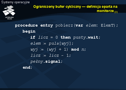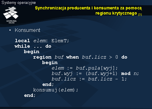 Jeśli bufor nie jest pusty, konsument pobiera z pozycji, indeksowanej przez wyj element, który staje się wartością parametru wyjściowego. Zmienna wyj zwiększana jest cyklicznie, żeby wskazywała kolejny element, po czym następuje zmniejszenie zmiennej licz , gdyż w buforze zwolniła się miejsce po pobranym elemencie.