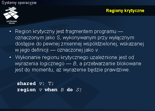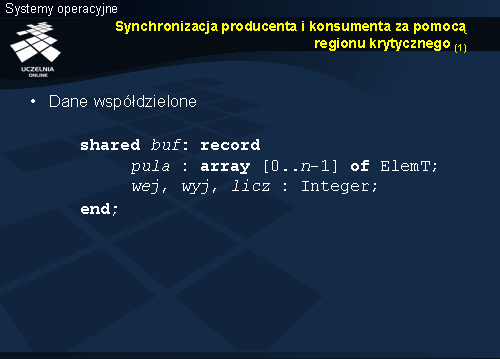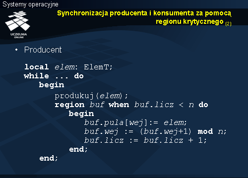Wzajemne wykluczanie dotyczy fragmentu kodu objętego konstrukcją region , zatem trzech operacji podstawienia, modyfikujących składowe rekordu buf . Takie same operacje w przypadku monitora znajdowały się w implementacji wejścia wstaw.
