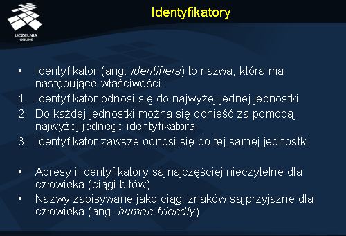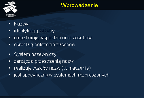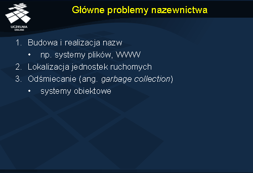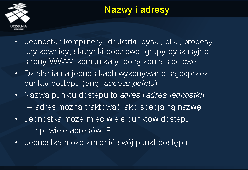 Stosowanie nazw jest wygodne ponieważ uniezależnia nas od zmieniających się adresów. Przykładem może być posługiwanie się nazwą serwera FTP zamiast jego adresem IP. Zmiana lokalizacji serwera i rekonfiguracja systemu nazewniczego powodują, że serwer jest nadal dostępny pod tą samą nazwą, pomimo zmiany adresu IP (czyli punktu dostępu). Nazwy, które nie zawierają w sobie elementów adresów są określane jako nazwy niezależne od położenia (ang. location independent ).