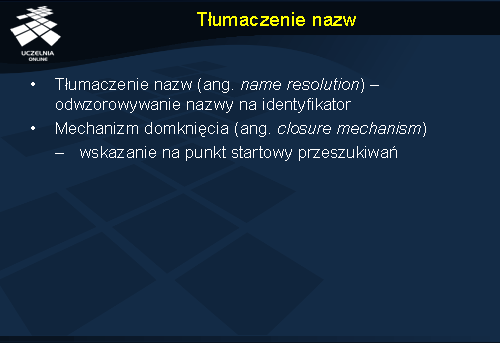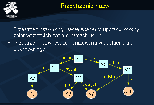 Jeden z węzłów w przedstawionym grafie nie posiada krawędzi przychodzących (węzeł X1). Jest to tzw. korzeń (ang. root node ) grafu nazewniczego. Z reguły w systemach nazewniczych występuje tylko jeden korzeń.