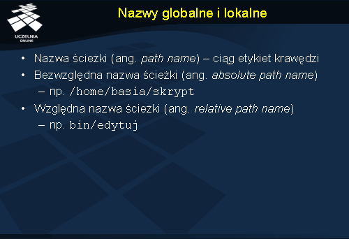 W systemach plików do zapisu nazw plików stosuje się notację korzystającą z ukośników do oddzielania nazw poszczególnych krawędzi w grafie. Zapis / home/basia/skrypt oznacza więc odwołanie do pliku skrypt znajdującego się w katalogu basia , który z kolei jest podkatalogiem katalogu home , a ten jest bezpośrednim podkatalogiem katalogu głównego (korzenia systemu plików). Zapis „/” oznacza tu korzeń. Warto zauważyć, że ten sam plik jest dostępny również pod inną nazwą bezwzględną: / usr/bin/edytuj . W tym przypadku graf jest grafem skierowanym acyklicznym. Niektóre usługi nazewnicze dopuszczają jednie ściśle hierarchiczną postać, w więc graf nazw jest tam drzewem (każda jednostka ma dokładnie jedną bezwzględną nazwę ścieżki).