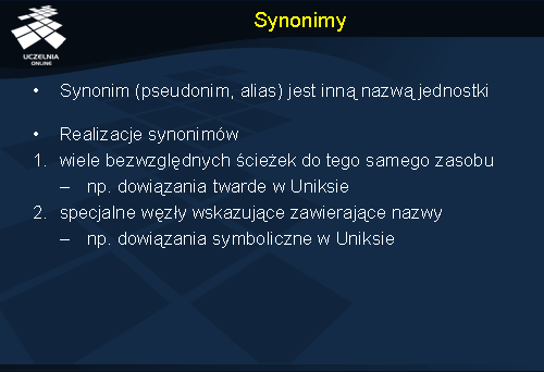 Synonimy mogą być implementowane na dwa sposoby. Pierwszy polega na rejestrowaniu kilku równoważnych nazw, w dowolnych miejscach hierarchii nazw, odnoszących się do tych samych zasobów. Rozwiązanie takie jest stosowane np. w uniksowych systemach plików w formie dowiązań twardych (ang. hard links ). Drugi sposób reprezentacji synonimów polega na utworzeniu specjalnych węzłów-liści w grafie nazewniczym, które nie identyfikują docelowych jednostek, a jedynie zawierają docelowe nazwy, z których należy skorzystać w dalszej kolejności. Proces tłumaczenia nazw po napotkaniu na taki węzeł specjalny inicjuje kolejny proces tłumaczenia dla nazwy pobranej z węzła specjalnego. W uniksowych systemach plików rozwiązanie takie określane jest jako dowiązania symboliczne (ang. symbolic links ).
