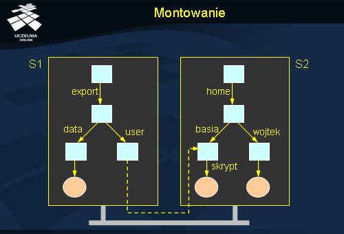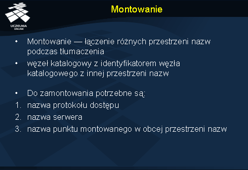 Montowanie wymaga odwzorowania kilku nazw identyfikujących zdalny zasób: protokół musi być skojarzony z odpowiednią implementacją, nazwa serwera musi być przetłumaczona na adres, i w końcu nazwa punktu montowanego na jego identyfikator. Wszystkie parametry identyfikujące zdalny zasób mogą być zakodowane np. w postaci URL. Np. nfs :// galio.cs.put.poznan.pl/usr/local identyfikuje zdalny węzeł katalogowy / usr/local na serwerze galio.cs.put.poznan.pl dostępny za pośrednictwem protokołu NFS.