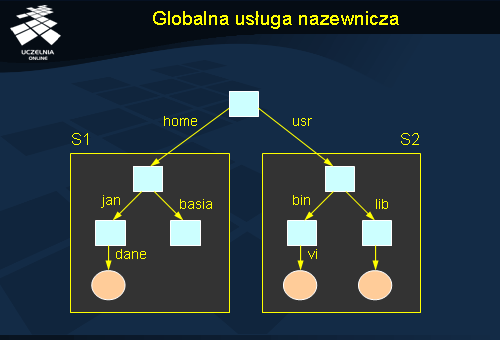 Przedstawiony rysunek jest przykładem organizacji nazw dla systemu plików. Węzły-liście to pliki a węzły katalogowe to po prostu katalogi.