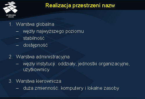 Duże przestrzenie nazw są organizowane najczęściej hierarchicznie. Jeżeli mają obsługiwać również dużą liczbę użytkowników rozproszonych geograficznie, to automatycznie sama usługa nazewnicza również musi być realizowana z wykorzystaniem wielu serwerów. Strukturę dużej przestrzeni nazw można podzielić na trzy logiczne warstwy. Warstwa globalna jest tworzona przez węzły najwyższego poziomu (korzeń i bliskie mu węzły). Na tym poziomie konfiguracja jest raczej stabilna, a najważniejszym wymaganiem stawianym serwerom tej warstwy jest wysoka dostępność. Niżej ulokowana jest warstwa administracyjna, w której ulokowane są węzły reprezentujące poszczególne organizacje i ich oddziały. Na tym poziomie mogą się znaleźć również węzły reprezentujące poszczególnych użytkowników (pracowników). Najniższa warstwa – warstwa kierownicza – zawiera węzły, które są najbardziej podatne na zmiany, a więc węzły reprezentujące poszczególne komputery i zasoby przechowywane na tych komputerach. Warstwa ta jest o tyle szczególna, że jej zarządzaniem zajmują się również indywidualni użytkownicy, modyfikując wpisy za które są odpowiedzialni.