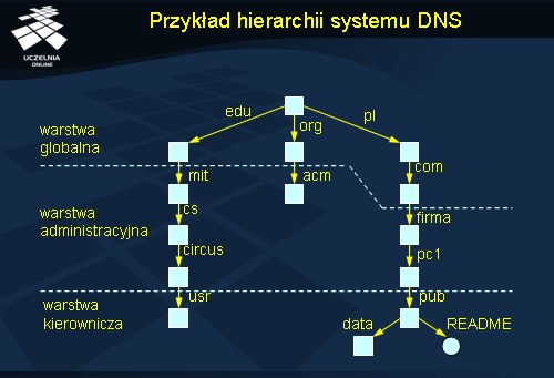 Poddrzewa przestrzeni nazw w systemie DNS są nazywane domenami (ang. domain ). Nazwa ścieżki od korzenia całej przestrzeni nazw do korzenia domeny nazywamy nazwą domeny (ang. domain name ). Domena może obejmować kilka stref, np. domena poznan.pl może obejmować zarówno strefę put.poznan.pl jak i strefę man.poznan.pl .