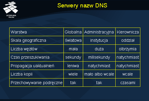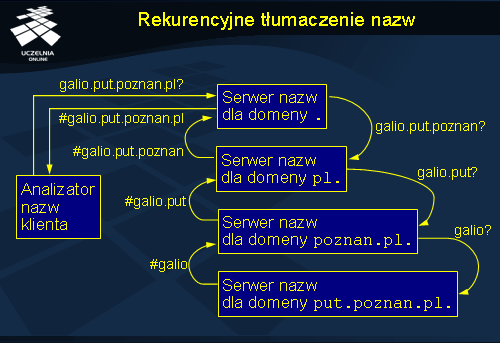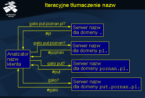 Tłumaczenie nazw realizowane jest przez oprogramowanie klienta zwane analizatorem nazw (ang. name resolver ). Tłumaczenie iteracyjne, przedstawione na slajdzie, kontrolowane jest w całym zakresie przez klienta. Rozpoczyna się ono od wysłania zapytania o nazwę do serwera domeny głównej. W tym przypadku realizowane jest tłumaczenie nazwy galio.put.poznan.pl . Serwer domeny głównej nie zna odpowiedzi na to pytanie i nie może dokonać pełnego przetłumaczenia tej nazwy na adres, ale wie jaki serwer jest odpowiedzialny za domenę pl , która występuje na końcu tłumaczonej nazwy. W odpowiedzi serwer domeny głównej wysyła adres serwera domeny pl (oznaczony jako #pl). Klient uzyskując tą informację, wysyła kolejne zapytanie tym razem do serwera domeny pl , próbując przetłumaczyć pozostałą część poszukiwanej nazwy, a więc galio.put.poznan . Serwer nazw domeny pl odpowiada wskazując na serwer nazw domeny poznan.pl . Ostatecznie pytanie trafia do serwera nazw domeny put.poznan.pl , gdzie przechowywane są dane o komputerach znajdujących się w tej domenie, a więc m.in. o komputerze galio . Klient uzyskuje w ten sposób adres odpowiadający nazwie galio.put.poznan.pl .