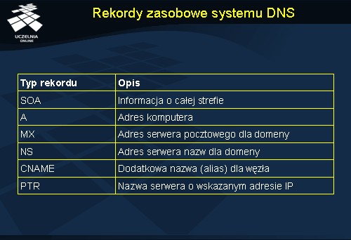 Konfiguracja domeny opisana jest zbiorem rekordów zasobowych (ang. resource records ). Tabelka przedstawia najczęściej wykorzystywane typy rekordów zasobowych. Rekord SOA (ang. Start of Authority ) zawiera podstawowe informacje opisujące strefę, m.in. adres poczty elektronicznej administratora systemu. Rekord A (adres), najczęściej stosowany, zawiera adres IP przypisany do konkretnej nazwy domenowej. Dla komputerów z kilkoma adresami IP definiuje się kilka rekordów A. Rekord MX (ang. mail exchange ) zawiera wskazanie na serwer obsługujący pocztę dla danej domeny. Dla strefy może być zdefiniowanych kilka rekordów MX, każdy kolejny wskazuje na zapasowe serwery pocztowe. Rekordy NS (ang. name server ) zawierają adres serwera nazw obsługującego daną strefę. Na podstawie rekordów NS serwery nazw wiedzą gdzie kierować zapytania w celu dalszego tłumaczenia nazwy, której dany serwer nie potrafi do końca przetłumaczyć.