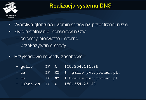 W slajdzie przedstawiono przykładowe rekordy zasobowe jakie mogłyby się znaleźć w pliku strefowym dla strefy put.poznan.pl . Pierwszy rekord A definiuje nazwę galio w domenie put.poznan.pl , a więc nazwę galio.put.poznan.pl , której przypisany został adres 150.254.111.89. Rekord MX wskazuje na serwer pocztowy dla poddomeny cs.put.poznan.pl . Kolejny rekord (NS) definiuje serwer nazw dla poddomeny cs ; będzie nim komputer libra.cs.put.poznan.pl . Ponieważ sama nazwa serwera nazw dla domeny podrzędnej nie jest wystarczająca dla skontaktowania się z tym serwerem, w pliku znajduje się również tzw. rekord łączący, zawierający adres komputera libra (rekord A). Dzięki tym dwóm ostatnim rekordom możliwe jest poprawne przekazanie pytań o nazwy z domeny cs.put.poznan.pl do odpowiedniego serwera nazw.