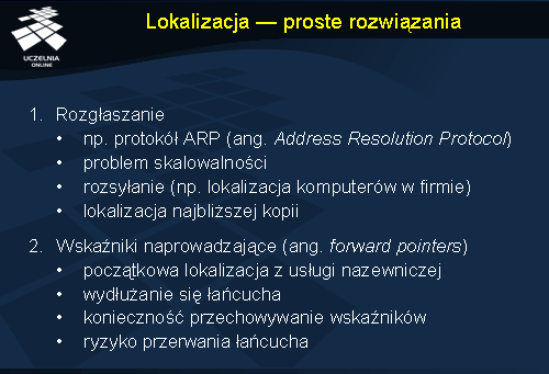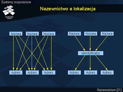 Usługi nazewnicze zwracają identyfikator jednostki. Ponieważ identyfikator nigdy się nie zmienia można go lokalnie zapamiętać i dowolnie długo przechowywać. Nazwa danej jednostki może się w przyszłości zmienić, ale to nie wymaga ponownego odpytywania usługi nazewniczej, ponieważ znany jest już identyfikator poszukiwanej jednostki. Odwołanie się do jednostki wymaga jednaj jej zlokalizowania i jest to zadanie usługi lokalizacji (ang. location service ). Usługa lokalizacji dokonuje odwzorowania identyfikatora jednostki na adres (lub zbiór adresów).