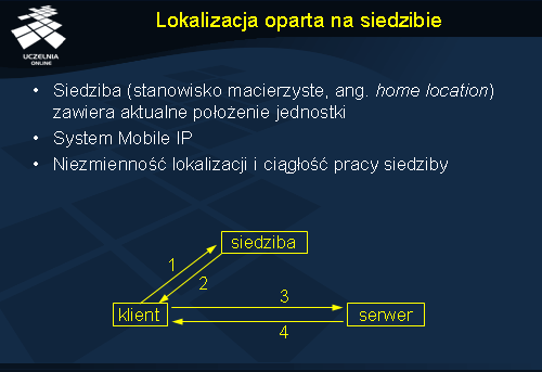 Rozwiązanie oparte na siedzibie zastosowano w systemie Mobile IP umożliwiającym komunikację z przemieszczającymi się komputerami. Dla każdego mobilnego komputera przewidziano program komunikacyjny (agent siedziby), dostępny zawsze pod tym samym adresem IP. Klient komunikuje się najpierw z agentem (1), próbując uzyskać aktualny adres serwera. Agent odpowiada (2) wysyłając adres serwera. Dalsza komunikacja (3-4) odbywa się już bezpośrednio pomiędzy klientem a serwerem. Wadą tego rozwiązania w przypadku stosowania w sieciach na szeroką skalę jest konieczność przeprowadzenia dodatkowej wymiany komunikatów z siedzibą, która może być zlokalizowana w zupełnie innym miejscu niż właściwy serwer.