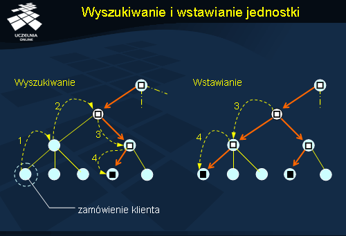 Wstawianie informacji o nowej jednostce (rysunek po prawej) przebiega podobnie do operacji wyszukiwania. Załóżmy, że żądanie wstawienia pojawiło się w tej samej domenie-liściu, co w poprzednim przypadku. Żądanie takie jest przekazywane do węzłów nadrzędnych, aż dotrze do węzła, który posiada już odpowiedni rekord położenia (kroki 1 i 2). Jeżeli jest to rejestracja pierwszej kopii jednostki, to żądanie takie może trafić aż do korzenia. W węźle, który zna już rejestrowaną jednostkę (lub w korzeniu) następuje dodanie nowego rekordu ze wskaźnikiem do węzła podrzędnego zawierającego jednostkę. Następnie, żądanie przechodzi tą samą ścieżkę do miejsca, z którego wyszło, dodając po drodze wskaźniki tworzące ścieżką prowadzącą do domeny-liścia (kroki 3 i 4). W domenie-liściu następuje dodanie odpowiedniego rekordu położenia z adresem nowej jednostki.