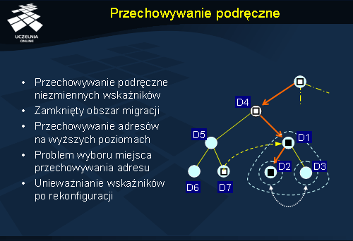Zastosowanie przechowywania podręcznego wskaźników może być pomocne, ale trzeba rozwiązać kilka problemów szczegółowych. Po pierwsze należy w jakiś sposób dokonać wyboru miejsca przechowywania adresu jednostki (w naszym przykładzie jest to węzeł katalogowy domeny D1). Po drugie należy dokonywać unieważniania wskaźników po rekonfiguracji danych w systemie nazewniczym. W powyższym przypadku rekonfiguracja byłaby potrzebna, gdyby powstała nowa kopia poszukiwanej jednostki np. w domenie D6. Zapytania zgłaszane w domenie D7 powinny wy tym przypadku być kierowane do nowej kopii, która jest najbliższa. Niestety nieaktualny wskaźnik przeniósłby poszukiwania do węzła domeny D1.
