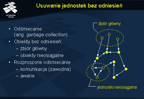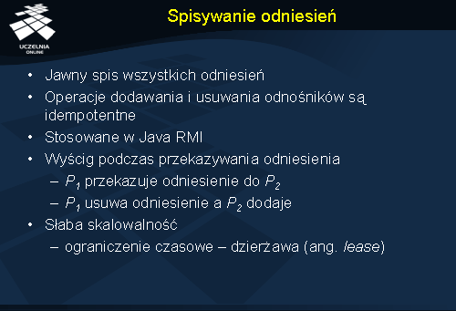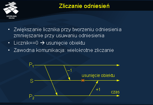 Inny problem może wyniknąć z przekazywania odwołań pomiędzy procesami. Załóżmy, że proces P1 przekazuje do procesu P2 odwołanie do obiektu umieszczonego na serwerze S. Po wykonaniu tej operacji proces P1 nie potrzebuje już obiektu, więc wysyła do serwera żądanie zmniejszenia licznika odwołań. Jeżeli było to jedyne odwołanie w systemie, to może nastąpić w tym momencie usunięcie obiektu (licznik osiągnie wartość 0), dlatego że proces P2 nie zdążył jeszcze zarejestrować odwołania, które właśnie dostał od P1. Rozwiązaniem tego problemu może być wprowadzenie dodatkowego komunikatu wysyłanego przez proces P1 do serwera S przed przekazaniem odwołania do P2, informującego, że będzie przekazywane odwołanie. Dzięki temu obiekt nie zostanie usunięty nawet, jeżeli jego licznik odwołań osiągnie wartość zero.