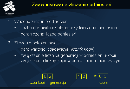 Innym rozwiązaniem opartym na pośredniości jest pokoleniowe zliczanie odniesień (ang. generation reference counting ). Każde odniesienie jest opatrzone podwójnym licznikiem, gdzie pierwsza wartość oznacza liczbę kopii utworzonych na podstawie tego odniesienia, a druga oznacza generację odniesienia. Jeżeli na podstawie odniesienia P tworzona jest kopia Q, to licznik kopii w odniesieniu P jest zwiększany, a numer generacji kopii Q jest inicjowany na wartość o jeden większą od licznika generacji w P. Usuwając odniesienie wysyłane są obie wartości liczbowe. Serwer obiektu przechowuje tablicę G, w której pozycja i-ta oznacza liczbę kopii i-tej generacji. Usuwając odniesienie z parą (i , k ) zmniejszana jest o 1 wartość na pozycji G[i ] i jednocześnie zwiększana o k na pozycji G[i+1 ]. Obiekt można usunąć gdy cała tablica G zostanie wyzerowana. Zaletą tego rozwiązania jest brak konieczności kontaktowania się z serwerem obiektu podczas tworzenia nowego odniesienia.