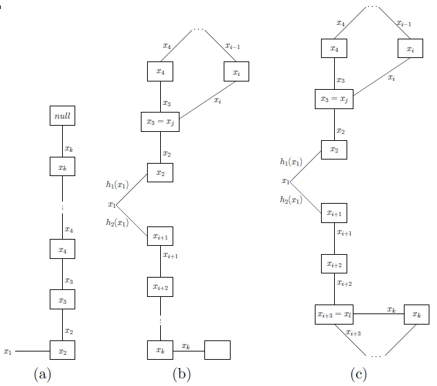 Mianowicie, zobaczmy co się dzieje gdy marszruta po raz pierwszy powraca do wierzchołka, w którym już była, tzn. pewien klucz \(x_i\) jest wstawiany w miejsce klucza \(x_j\), dla pewnego \(j< i\). Wówczas \(x_j\) jest wstawiany w miejsce \(x_{j-1}\), \(x_{j-1}\) w miejsce \(x_{j-2}\) itd, czyli cofamy się wzdłuż marszruty aż do komórki \(T_1[h_1(x_1)]\). Następnie odwiedzana jest komórka \(T_2[h_2(x_1)]\). Od tej chwili marszruta ponownie może odwiedzać nowe klucze. Jeśli w pewnej chwili natrafi na pustą komórkę, operacja Insert się zakończy. W takiej sytuacji powiemy, że mamy do czynienia z pojedynczym cyklem (patrz rysunek 1b). Jeśli natomiast marszruta ponownie natrafi na wcześniej odwiedzoną komórkę \(x_l\), to tak generowana marszruta bez końca będzie już poruszać się po krawędziach odpowiadających odwiedzonym kluczom (a dokładniej poruszałaby się bez końca, gdyby nie sztywne ograniczenie 2MAX_LOOP na liczbę wykonanych kroków, patrz rysunek c). Taką marszrutę nazwiemy podwójnym cyklem.