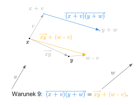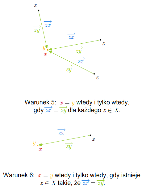 6. \(x=y\) wtedy i tylko wtedy, gdy istnieje \(z\in X\) takie, że \(\overrightarrow {zx}= \overrightarrow {zy}\),
