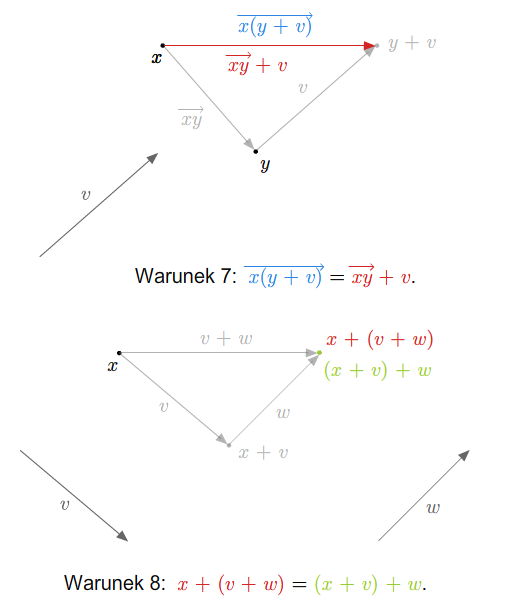 A1) Dla każdych \(x\in X\), \(v\in V\) zachodzi równoważność: \(x+v=y\) wtedy i tylko wtedy, gdy \(\overrightarrow {xy}=v\).