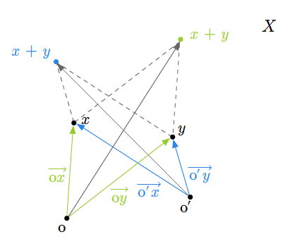 Dla \(x,y\in X\) punkt \(x+y\) jest równy takiemu punktowi \(z\in X\), że \(\overrightarrow {{\rm o} x} +\overrightarrow {{\rm o} y} = \overrightarrow {{\rm o} z}\).