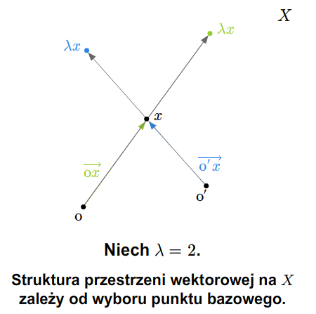 Dla \(x\in X\) i \(\lambda \in {\mathbb K}\) punkt \(\lambda x\) zdefiniowany jest jako punkt \(z\in X\) taki, że \(\overrightarrow {{\rm o} z}= \lambda \overrightarrow {{\rm o} x}.\)