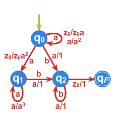 Poniższa animacja ilustruje działanie automatu ze stosem. Przedstawiony grafem automat ze stosem \(\displaystyle \mathcal{AS}=(A,A_{S},\{q_0,q_F\},P,q_{0},z_{0},\{q_{F}\})\), w którym alfabet stosu \(\displaystyle A_{S}=\{z_{0},a,b\}\) rozpoznaje język bezkontekstowy