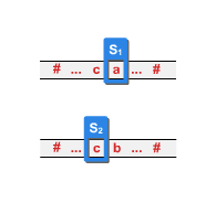 Konfiguracją automatu liniowo ograniczonego jest słowo \(\displaystyle vsw\in (\Sigma _{T}\cup S)^{*}\) , w którym \(\displaystyle s\in S,\; v,w\in \Sigma _{T}^{*}\) . Pomiędzy dwoma konfiguracjami \(\displaystyle d_{1},d_{2}\) zachodzi relacja bezpośredniego następstwa \(\displaystyle d_{1}\mapsto d_{2}\) wtedy i tylko wtedy, gdy spełniony jest jeden z niżej wypisanych warunków, gdzie \(\displaystyle s_{1},s_{2}\in S\) , \(\displaystyle a,b,c\in \Sigma _{T}\) oraz \(\displaystyle v,w\in \Sigma _{T}^{*}:\)