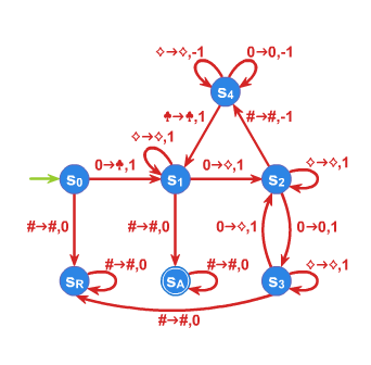 Łatwo zauważyć, że wprowadzona funkcja przejścia określa maszynę spełniającą postawione przez nas warunki. Symbol \(\displaystyle \clubsuit\) został wprowadzony dla odróżnienia wystąpienia pojedynczego zera od sytuacji, gdy liczba zer jest nieparzysta i większa od \(\displaystyle 1\).